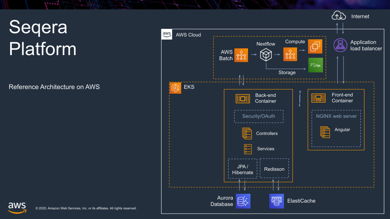 Reference architecture diagram of Seqera Platform Enterprise on AWS using Elastic Kubernetes Service (EKS)